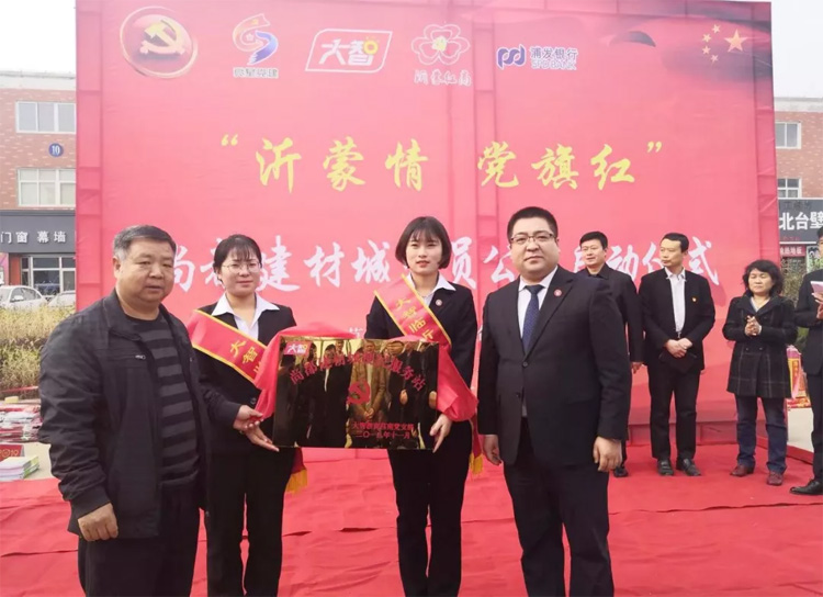 11月30日,臨沂市莒南縣市場監(jiān)督管理局、個體私營企業(yè)委員會與大智臨沂區(qū)域莒南黨支部聯(lián)合組織的黨員公益活動“沂蒙情 黨旗紅”啟動儀式在莒南尚都建材城隆重舉行。莒南市場監(jiān)督管理局副局長、機關(guān)黨委書記逯宗秋,市場監(jiān)督管理局公平交易局局長、個私黨委副書記盧勇成等領(lǐng)導及商城黨員、群眾代表參加活動。