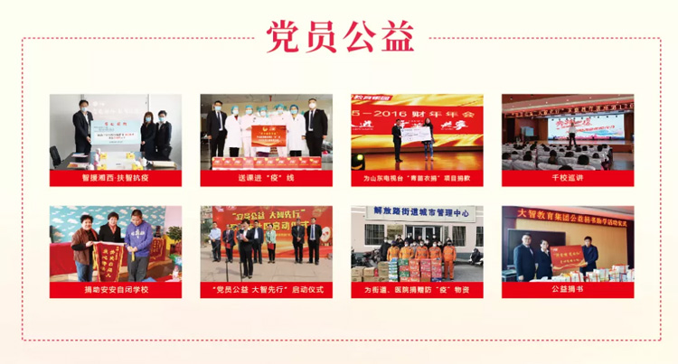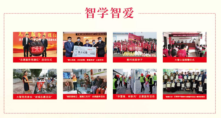 多年來(lái),在上級(jí)主管部門(mén)領(lǐng)導(dǎo)下,大智教育集團(tuán)積極踐行社會(huì)責(zé)任,把公益基因植入企業(yè)發(fā)展之中,啟動(dòng)了“黨員公益 大智先行”“千校巡講”“大智之星”齊魯學(xué)子獎(jiǎng)學(xué)金評(píng)選等公益項(xiàng)目,建立了“智學(xué)智愛(ài)”志愿服務(wù)隊(duì),積極參與到全國(guó)文明城市創(chuàng)建、泉城義工、抗疫援助等活動(dòng)中來(lái),形成了“智惠e”公益品牌。