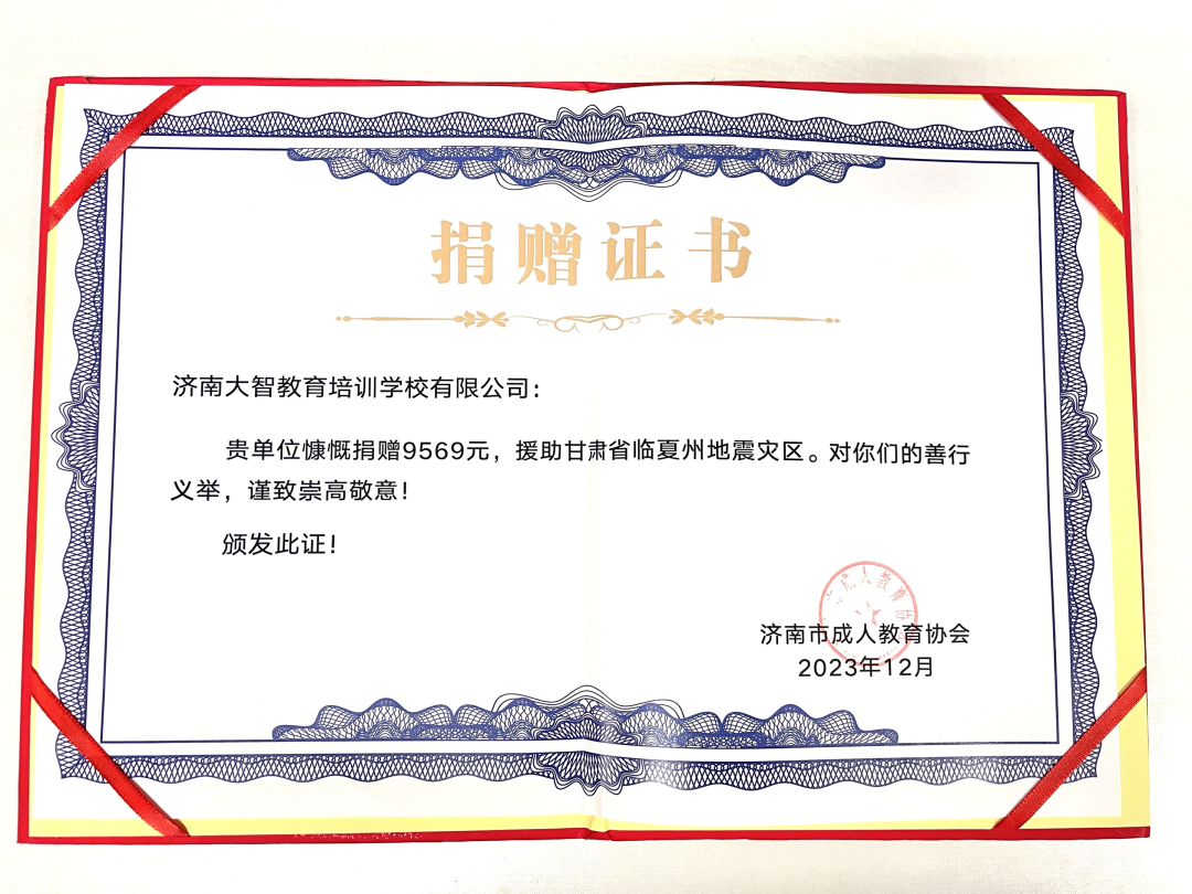 據(jù)悉,甘肅省臨夏州發(fā)生地震災(zāi)害,造成了大量人員傷亡和財產(chǎn)損失。濟(jì)南市成人教育協(xié)會聯(lián)合濟(jì)南報業(yè)集團(tuán)泉城義工總站、教育事業(yè)中心、濟(jì)南市教育培訓(xùn)行業(yè)團(tuán)工委共同發(fā)起濟(jì)南市教培行業(yè)愛心捐贈行動倡議。接到倡議后,大智金復(fù)立刻行動,積極捐款,用綿薄之力幫助災(zāi)區(qū)人民重建美好家園。