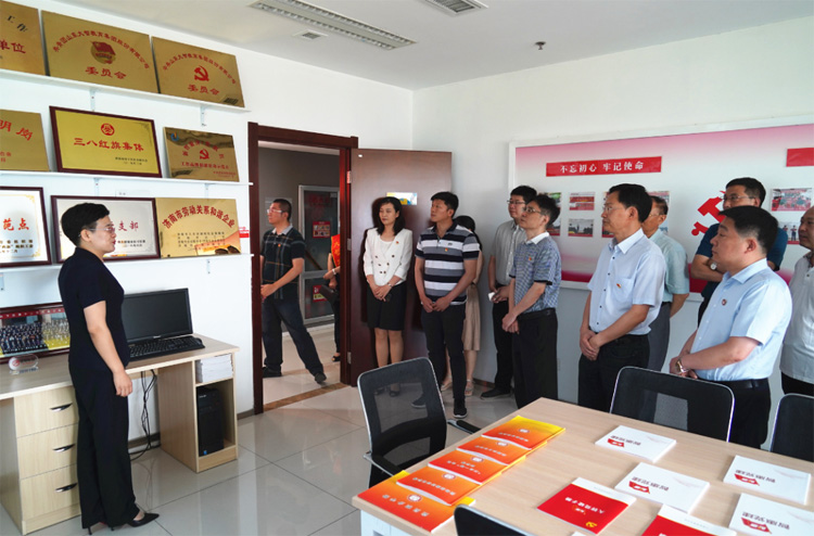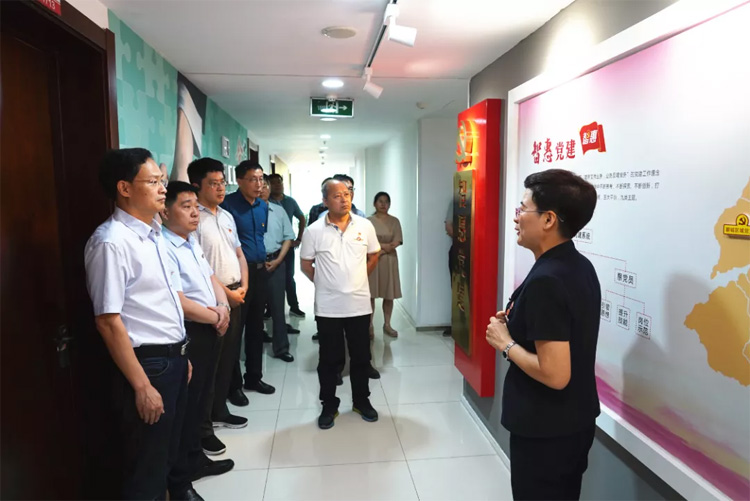 大智控股集團(tuán)黨委書記王現(xiàn)芹首先帶領(lǐng)大家參觀了大智黨群陣地,詳細(xì)介紹了大智“智惠黨建一三九”工作模式以及黨建引領(lǐng)下的大智 “一帶一促”群團(tuán)建設(shè)理念和“智惠+”群團(tuán)建設(shè)模式。