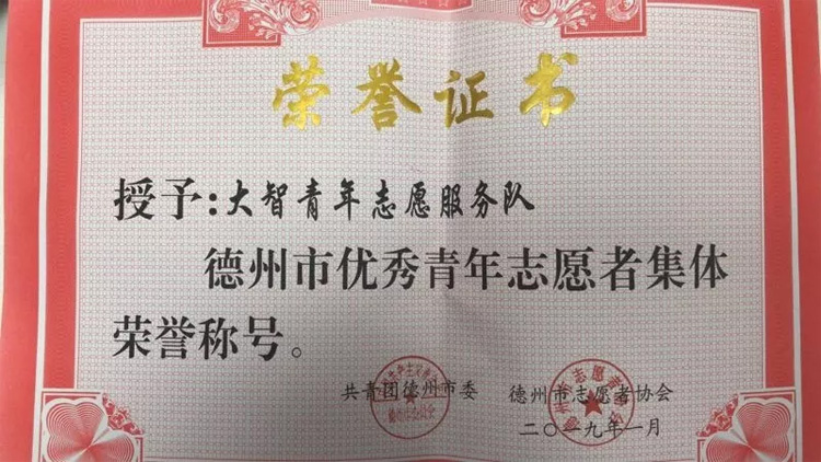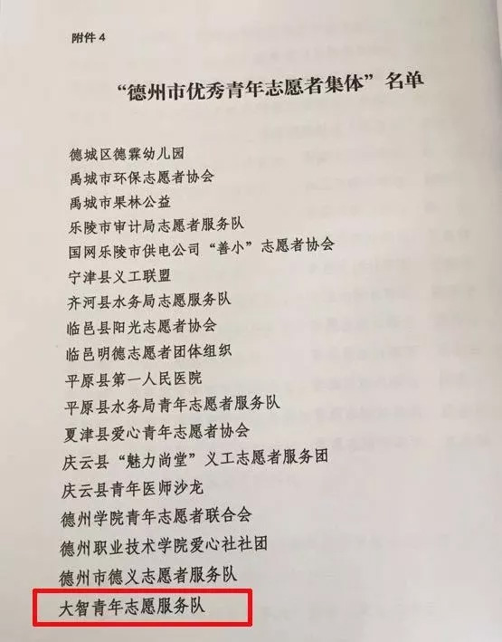 近日,共青團德州市委、德州市志愿者協(xié)會聯(lián)合發(fā)布《關(guān)于公布2018年度德州“最美(優(yōu)秀)青年志愿者、最美(優(yōu)秀)青年志愿者集體”的通知》,大智德州區(qū)域青年志愿服務(wù)隊被授予“德州市優(yōu)秀青年志愿者集體”。