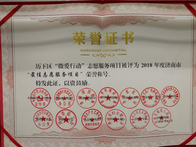 大智“微愛行動”志愿服務項目被授予“山東省2018年度最佳志愿服務項目”和“2018年度濟南市最佳志愿服務項目”榮譽稱號。