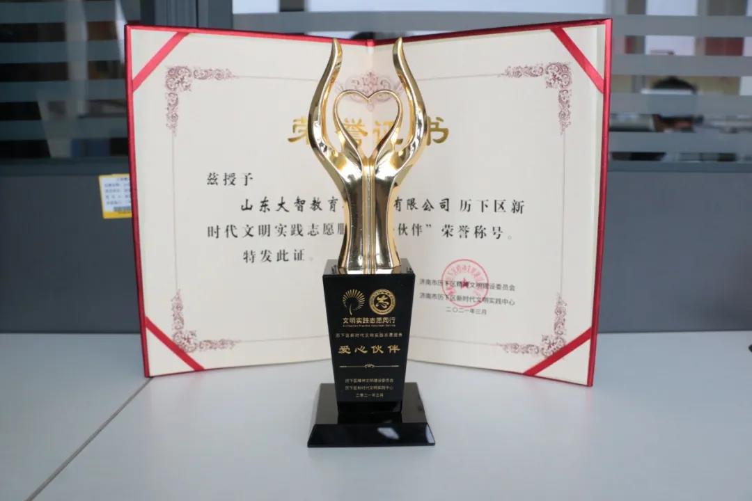 濟南市歷下區(qū)精神建設(shè)委員會和濟南市歷下區(qū)新時代文明實踐中心授予山東大智教育集團有限公司歷下區(qū)新時代文明實踐志愿服務(wù)“愛心伙伴”稱號,并授予了榮譽獎杯及證書。