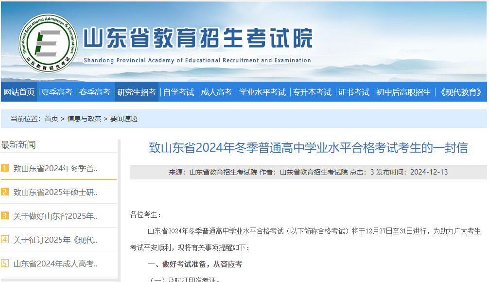 致山東省2024年冬季普通高中學業(yè)水平合格考試考生的一封信