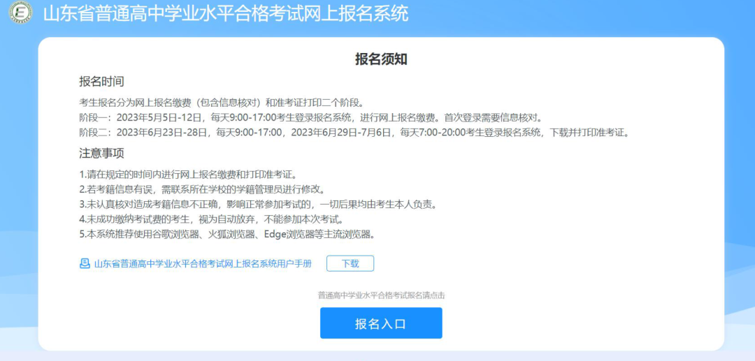 參加山東省2023年冬季普通高中學業(yè)水平合格考試(以下簡稱冬季合格考)的考生須于10月19日—26日每天9:00—17:00,登錄報名系統(tǒng)進行信息核對,信息核對無誤后直接進行網(wǎng)上選科繳費。繳費成功方視為報名完成,否則視為未報名成功,不能參加本次考試。