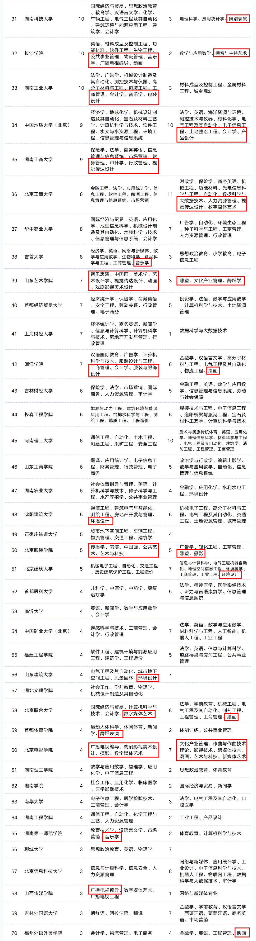 產(chǎn)品設(shè)計(jì)、服裝與服飾設(shè)計(jì)、數(shù)字媒體藝術(shù)、工業(yè)設(shè)計(jì)、高分子材料與工程、服裝設(shè)計(jì)與工程、動(dòng)畫、視覺傳達(dá)設(shè)計(jì)、環(huán)境設(shè)計(jì)、傳播學(xué)、表演、中國畫、公共藝術(shù)、藝術(shù)與科技