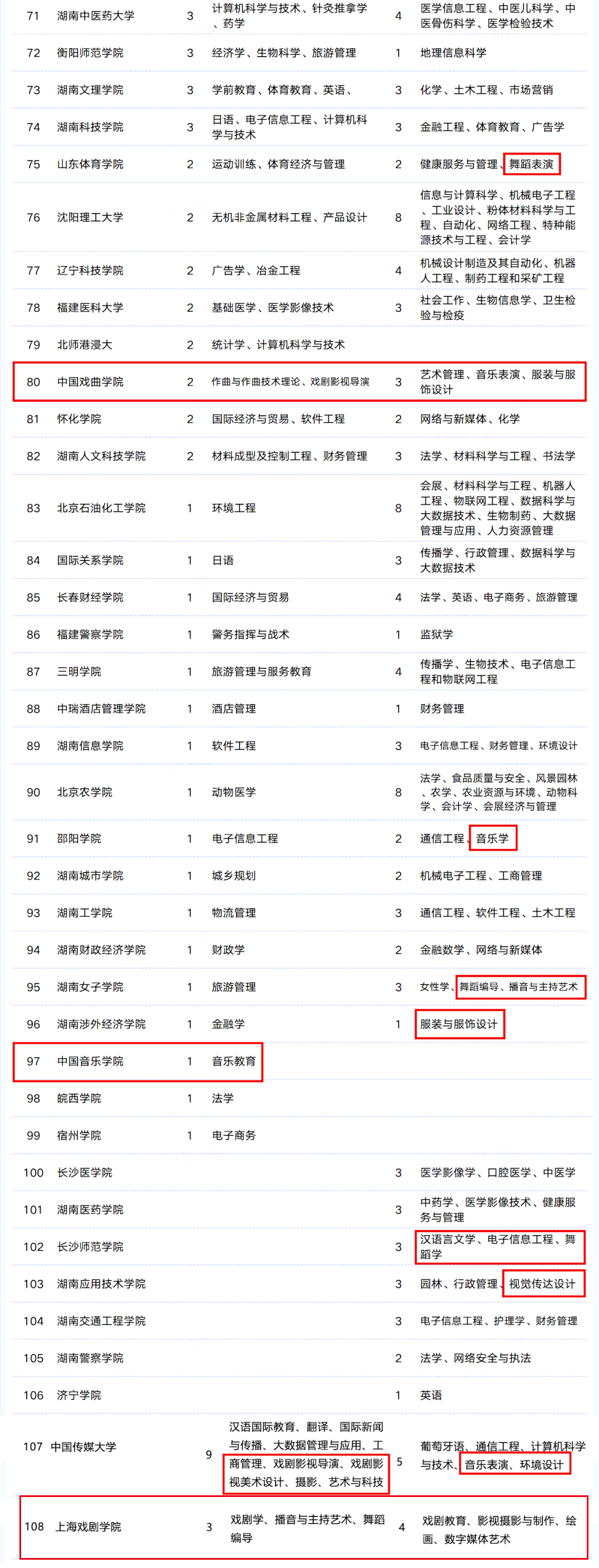 工藝美術(shù)、環(huán)境設(shè)計(jì)、舞蹈表演、音樂學(xué)、廣播電視編導(dǎo)、數(shù)字媒體藝術(shù)、書法學(xué)、音樂表演、中國畫、美術(shù)學(xué)、藝術(shù)設(shè)計(jì)學(xué)、視覺傳達(dá)設(shè)計(jì)、動(dòng)畫、戲劇影視美術(shù)設(shè)計(jì)