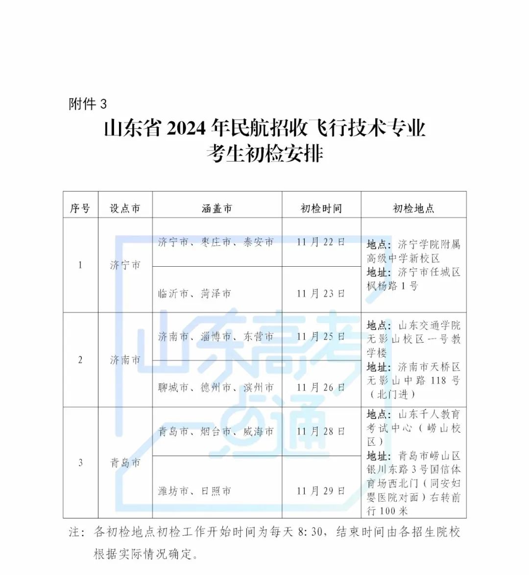 (二)初檢預(yù)選。招飛各項選拔工作由各院校具體組織實施。我省在濟(jì)南、青島、濟(jì)寧3市設(shè)立招飛初檢站,各招生院校按照規(guī)定時間在每個初檢站分別組織初檢預(yù)選工作,具體時間地點安排見附件3??忌殧y帶身份證及報考院校規(guī)定的證件材料等,按照附件3規(guī)定的時間地點到達(dá)指定初檢站,參加擬報考院校組織的民航飛行技術(shù)專業(yè)的初檢預(yù)選。