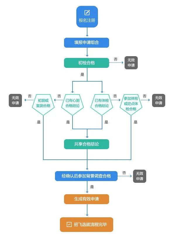 為幫助您在招飛選拔過程中節(jié)約時間和費用,便于您更好地備考,同時讓您有機會在更多的合格申請組合中選擇確認(rèn)有效招飛申請,系統(tǒng)對部分環(huán)節(jié)的結(jié)論在特定情況下設(shè)定了結(jié)論共享。請注意,這里的結(jié)論共享特指申請組合之間共享。