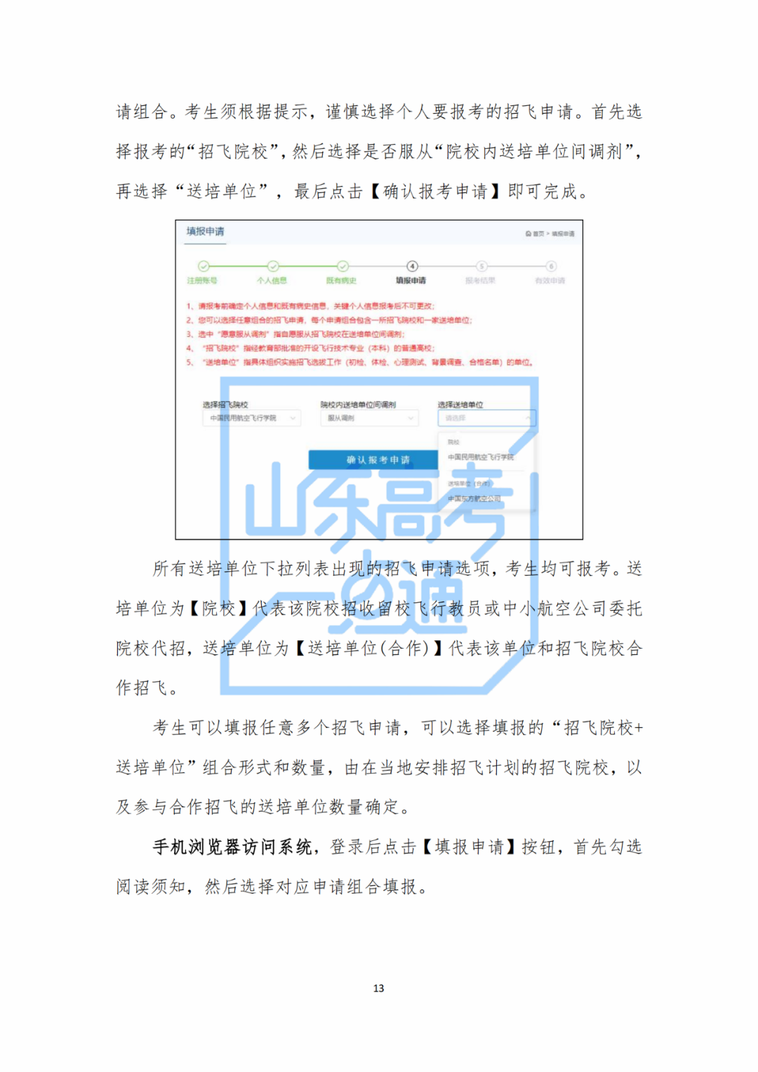 送培單位在招飛院校的組織下開展招飛工作。送培單位的招飛主管將聯(lián)系您參加各項選拔工作,并在招飛系統(tǒng)中對您報考本單位的相關(guān)信息及結(jié)果進(jìn)行設(shè)置、審核、跟蹤等。請注意,當(dāng)您在招飛系統(tǒng)中選擇的送培單位為招飛院校時,表示您畢業(yè)后的工作單位由招飛院校負(fù)責(zé)確定,或者留在學(xué)校成為飛行教員,由招飛院校的招飛主管負(fù)責(zé)您的選拔工作。當(dāng)您在招飛系統(tǒng)中選擇送培單位為送培單位(合作)時,表明在您的生源地送培單位由招飛院校主導(dǎo)參與合作招飛,由送培單位的招飛主管經(jīng)招飛院校授權(quán)后,負(fù)責(zé)您的選拔工作。