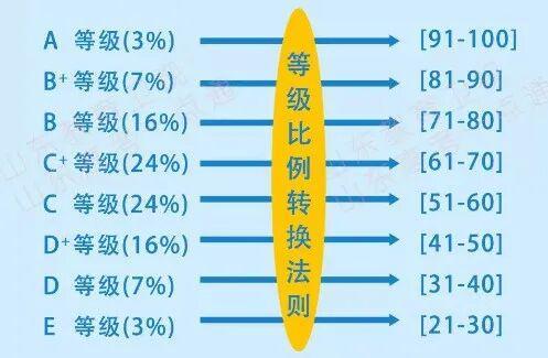 參照正態(tài)分布原則,確定各等級區(qū)間人數(shù)所占比例對應(yīng)著: A等級占3%、B+等級占7%、B等級占16%、C+等級占24%、C等級占24%、D+等級占16%、D等級占7%、E等級占3%。
