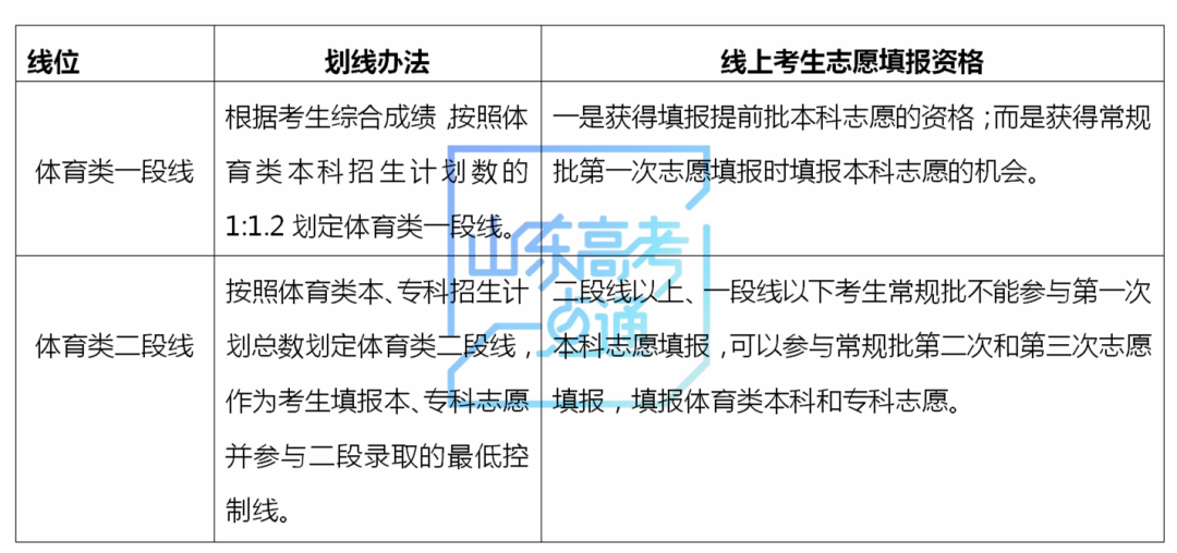 在專業(yè)成績合格生源范圍內(nèi)計(jì)算綜合分?jǐn)?shù),按綜合分?jǐn)?shù)劃定體育類一段線、二段線,按照體育類本科招生計(jì)劃數(shù)的1:1.2劃定體育類一段線,按照體育類本、專科招生計(jì)劃總數(shù)和生源情況劃定體育類二段線,作為考生參與錄取的最低控制線。