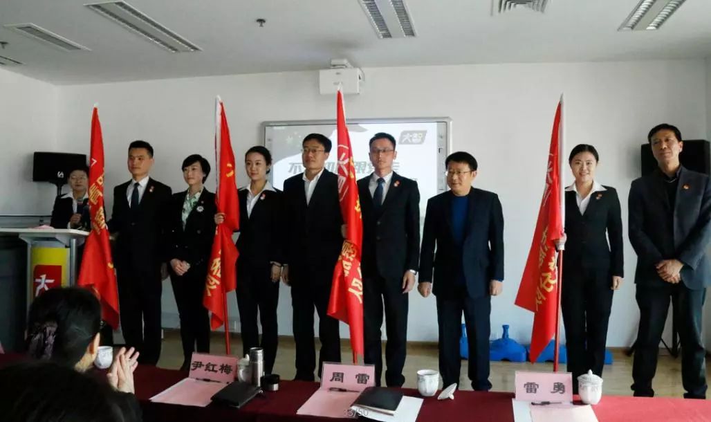 共青團濟南市委副書記王友進,共青團濟南市委組織部部長雷勇、中共濟南市歷下區(qū)委常委周雷、共青團歷下區(qū)委副書記杜慶姝為“大智青年志愿服務(wù)隊”授旗。