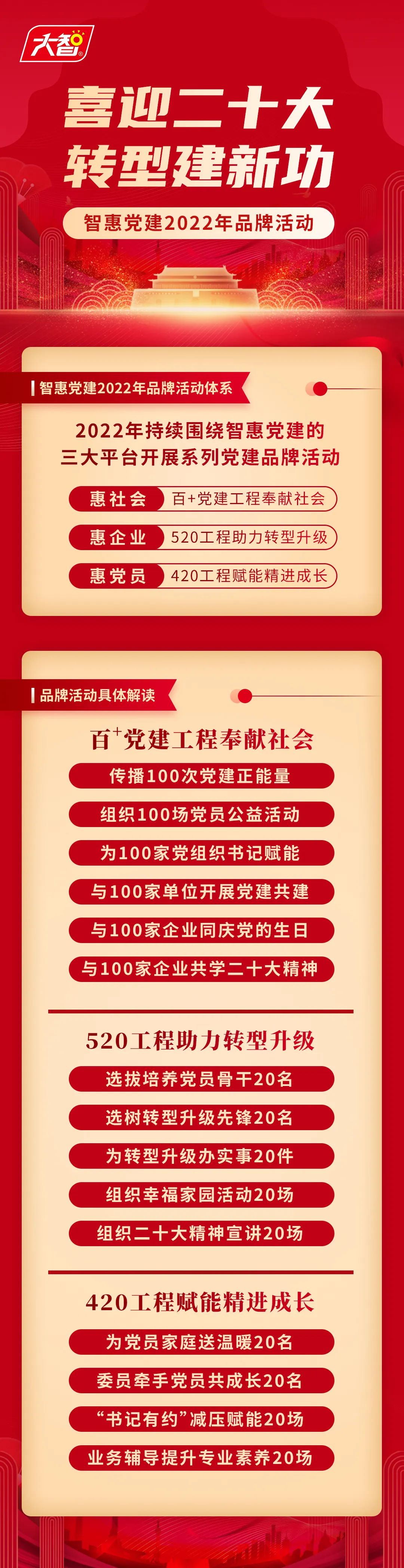 喜迎二十大,轉(zhuǎn)型建新功。大智控股集團黨委將扛起政治責(zé)任,強化使命擔(dān)當(dāng),以百倍的干勁,更實效的黨建品牌活動,為大智轉(zhuǎn)型升級做出應(yīng)有的貢獻,以更加優(yōu)異的成績迎接黨的二十大勝利召開。