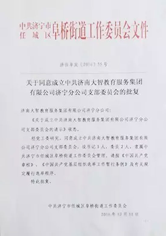 春暖花開(kāi),萬(wàn)物復(fù)蘇之際,2017年大智黨建工作乘著春風(fēng)又添喜訊!03月07日,中共濟(jì)寧市任城區(qū)阜橋街道委員會(huì)正式批復(fù)同意成立中共濟(jì)南大智教育...