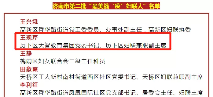 近日,濟南市婦聯(lián)公布了第二批最美戰(zhàn)“疫”巾幗典型,大智控股集團黨委書記、婦聯(lián)主席王現(xiàn)芹被評為濟南市第二批“最美戰(zhàn)‘疫’婦聯(lián)人”。在疫情防控第...
